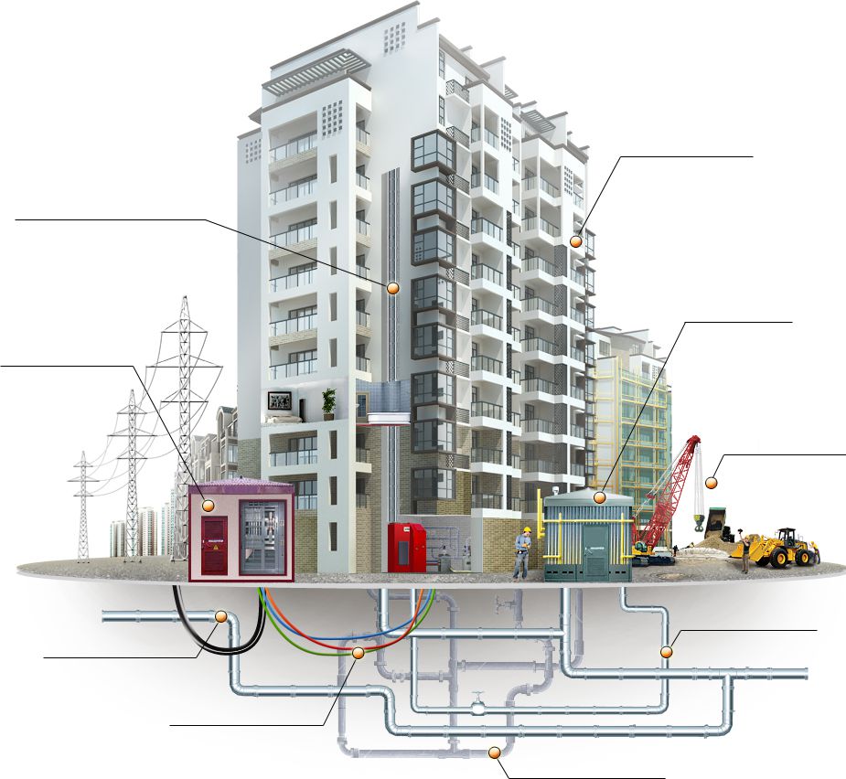 Электрические и тепловые сети, сети водопровода и канализации, дороги, площадки, мосты, резервуары и другие.